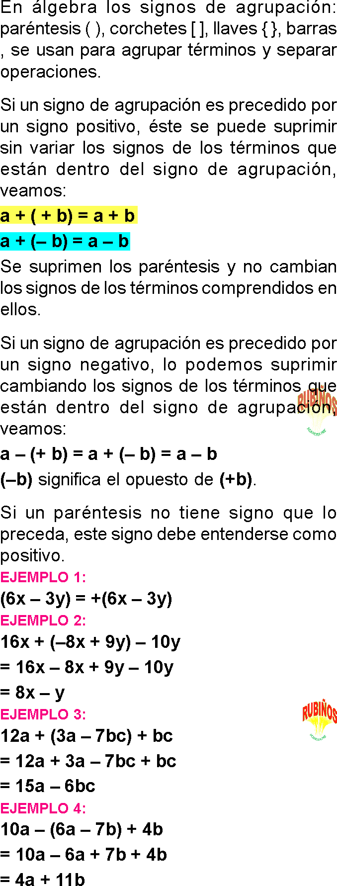 Si un signo de agrupación es precedido por un signo positivo, éste se puede suprimir sin variar los signos de los términos que están dentro del signo de agrupación, veamos: