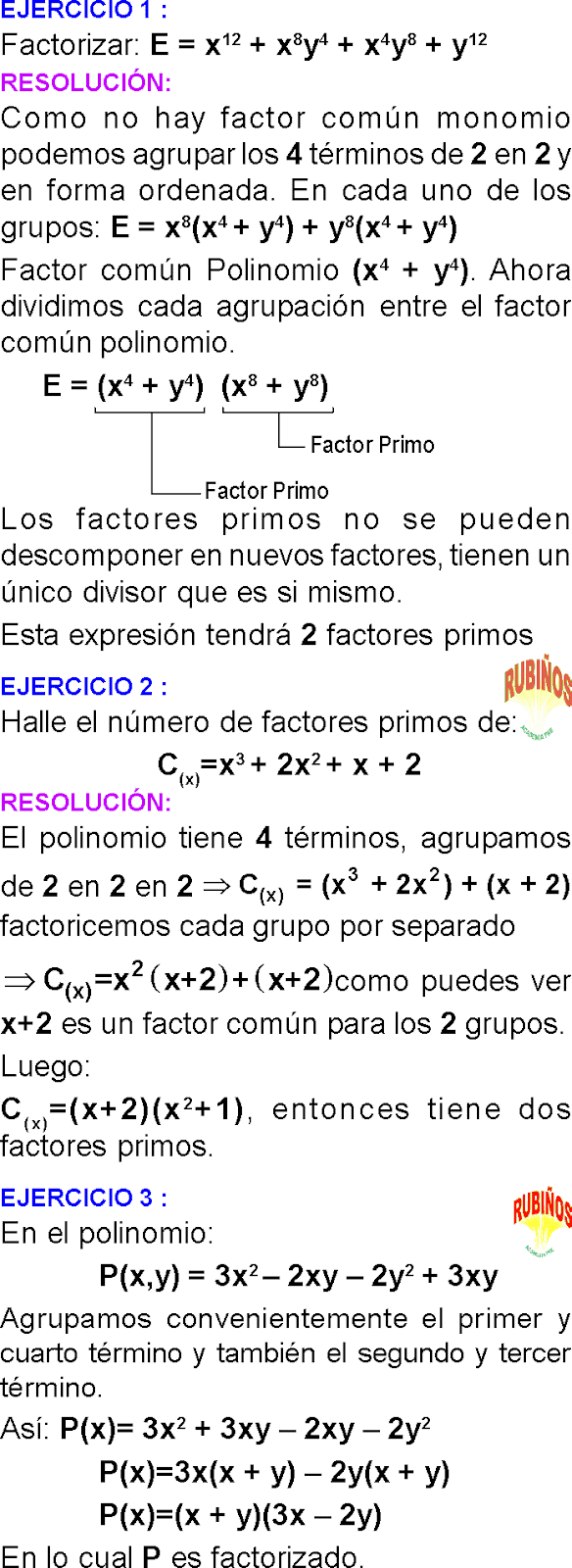 Se agrupan los términos de 2 en 2 o de 3 en 3, etc., de acuerdo con el número exacto de grupos que se puedan formar de modo que resulte un factor común polinomio.