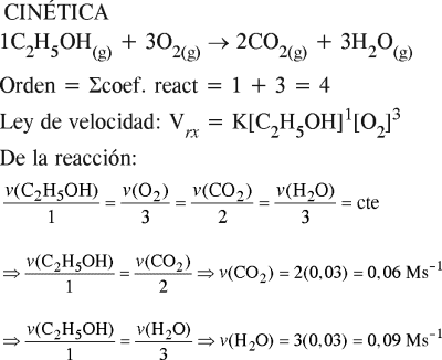 transcurre a una temperatura de 120ºC, en una sola etapa, es de cinética simple o elemental. Determine el orden de la velocidad de la reacción. En cierto instante, la velocidad de desaparición del etanol C2H5OH(g) fue de 0,03 Ms–1, para ese instante calcule la velocidad instantánea de aparición del CO2(g) y del H2O(g).