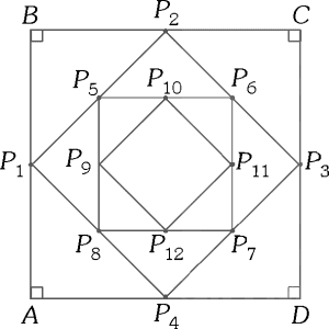 En la clase de Arte, la profesora propone hacer un cuadrado usando papel lustre de cuatro colores (azul, rojo, amarillo y verde, en ese orden). Ella da la siguiente indicación: primero, deben recortar un trozo de papel lustre de color azul de forma cuadrada y ubicar sus vértices en los puntos A, B, C y D. A continuación, deben utilizar los puntos medios de sus lados P₁, P₂, P₃ y P₄ como vértices del cuadrado de color rojo y pegar este cuadrado rojo sobre el cuadrado azul, tal como se muestra en la figura. Así, sucesivamente con el papel lustre amarillo y, finalmente, con el papel lustre verde con vértices en los puntos de P₉, P₁₀, P₁₁ y P₁₂. Halle la razón entre el perímetro del cuadrado azul y el perímetro del cuadrado verde.