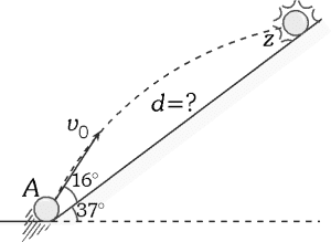 Desde el punto A se lanza un proyectil con una rapidez v0=80m/s, según se muestra. Determina la distancia d que logra impactar sobre el plano inclinado.