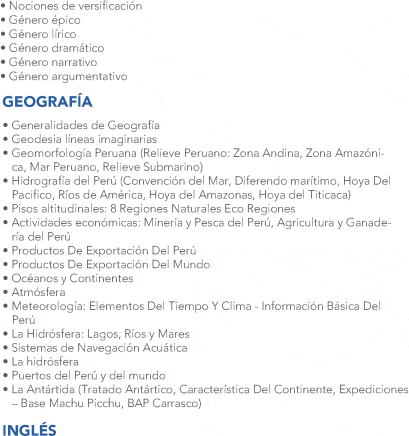 El examen será escrito y servirá para medir su nivel de conocimientos en las distintas áreas portando los siguientes útiles: lapicero negro, lápiz, borrador y tajador.