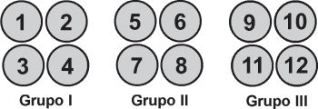 Erika tiene 12 bolos numerados del 1 al 12 los cuales, inicialmente, los agrupó en tres grupos como se muestra en la figura. Manteniendo la misma cantidad de bolos en cada grupo, ¿por lo menos cuántos bolos debe cambiar de posición, sin rotarlas, para que la suma de los números en cada grupo sea la misma?